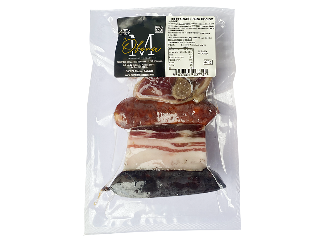 El preparado de cocido es un combinado muy completo, ideal para enriquecer cocidos de verduras o legumbres con un aporte extra de materia cárnica. Aporta sustancia y sabor, y una vez finalizada la cocción puede consumirse troceado, ya sea servido de manera individual o reincorporado al cocido, ofreciendo versatilidad y un resultado delicioso.